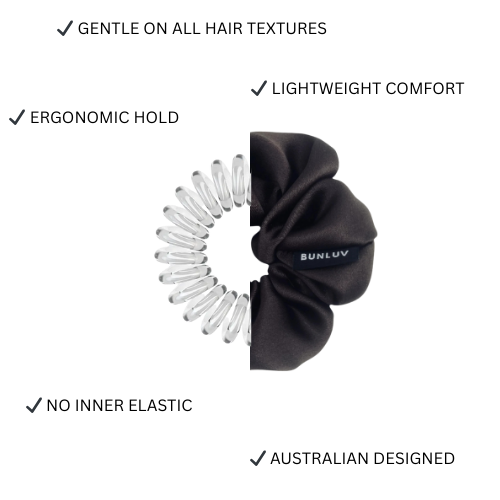 The BUNLUV SmartCore scrunchie features a spiral inner structure paired with a fabric outer layer. Designed as an alternative to traditional elastic hair ties, it offers a different approach to everyday hair styling.